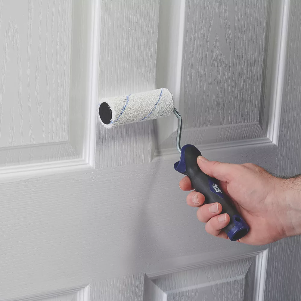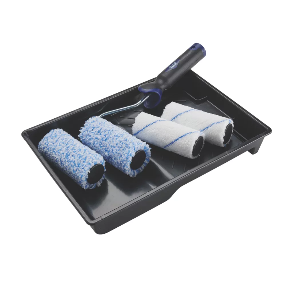 High quality jumbo mini gloss and emulsion roller set, containing everything needed for painting smaller, awkward areas. Emulsion sleeves are designed for fast, even coverage and a fine finish with water-based paints whilst the gloss sleeves provide a smooth finish with oil-based paints. Mini 4″ stick frame with short arm for awkward areas and sturdy 7″ roller tray with patterned roll-off area.