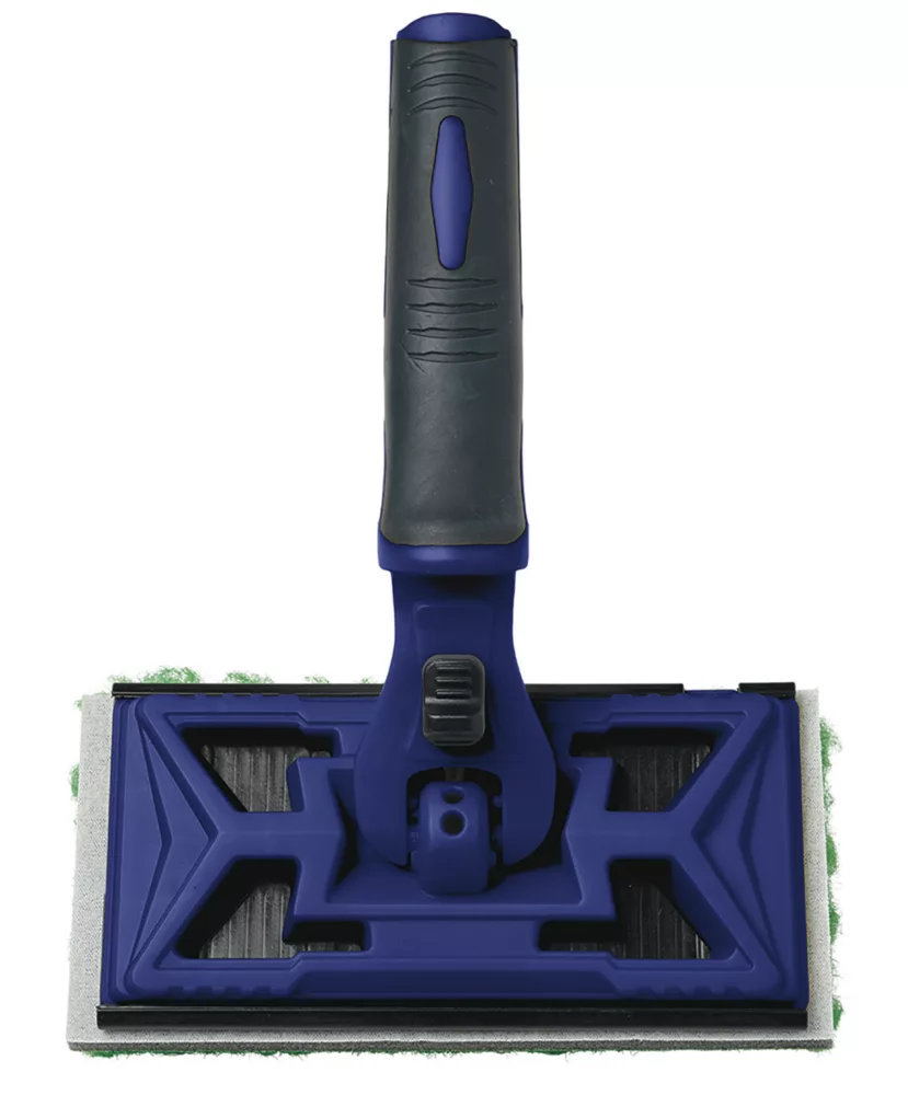 Decking head with attached decking pad for use with all types of oils, stains and paints. Swivel head with lock for hard to reach areas. Handle doubles as connector for easy attachment to extension poles for larger decking areas.