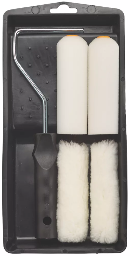Mini roller set suitable for use with emulsion and gloss paints. Tray has raised dimples for even paint loading.